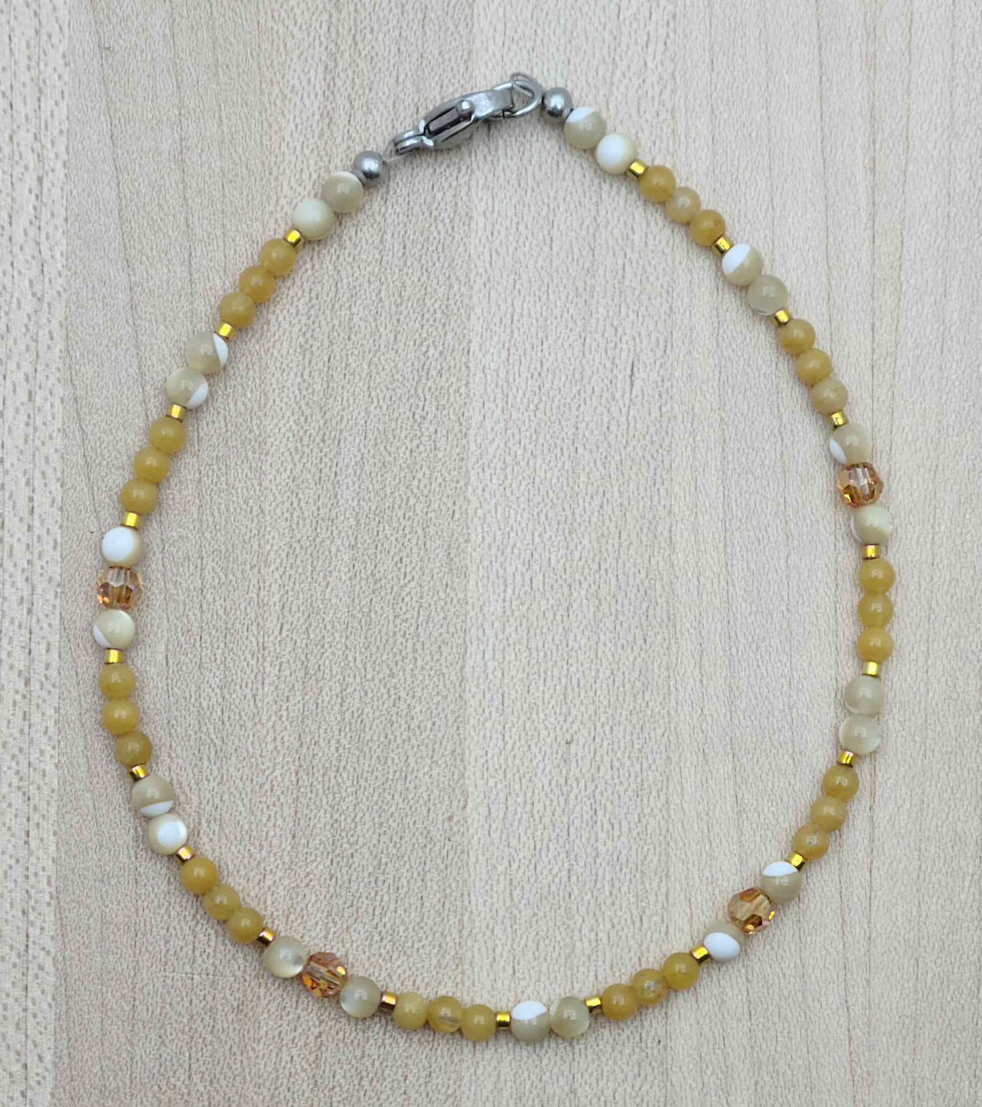 - Add a touch of joy and energy to your style with our Mother of Pearl & Yellow Jade Anklet.