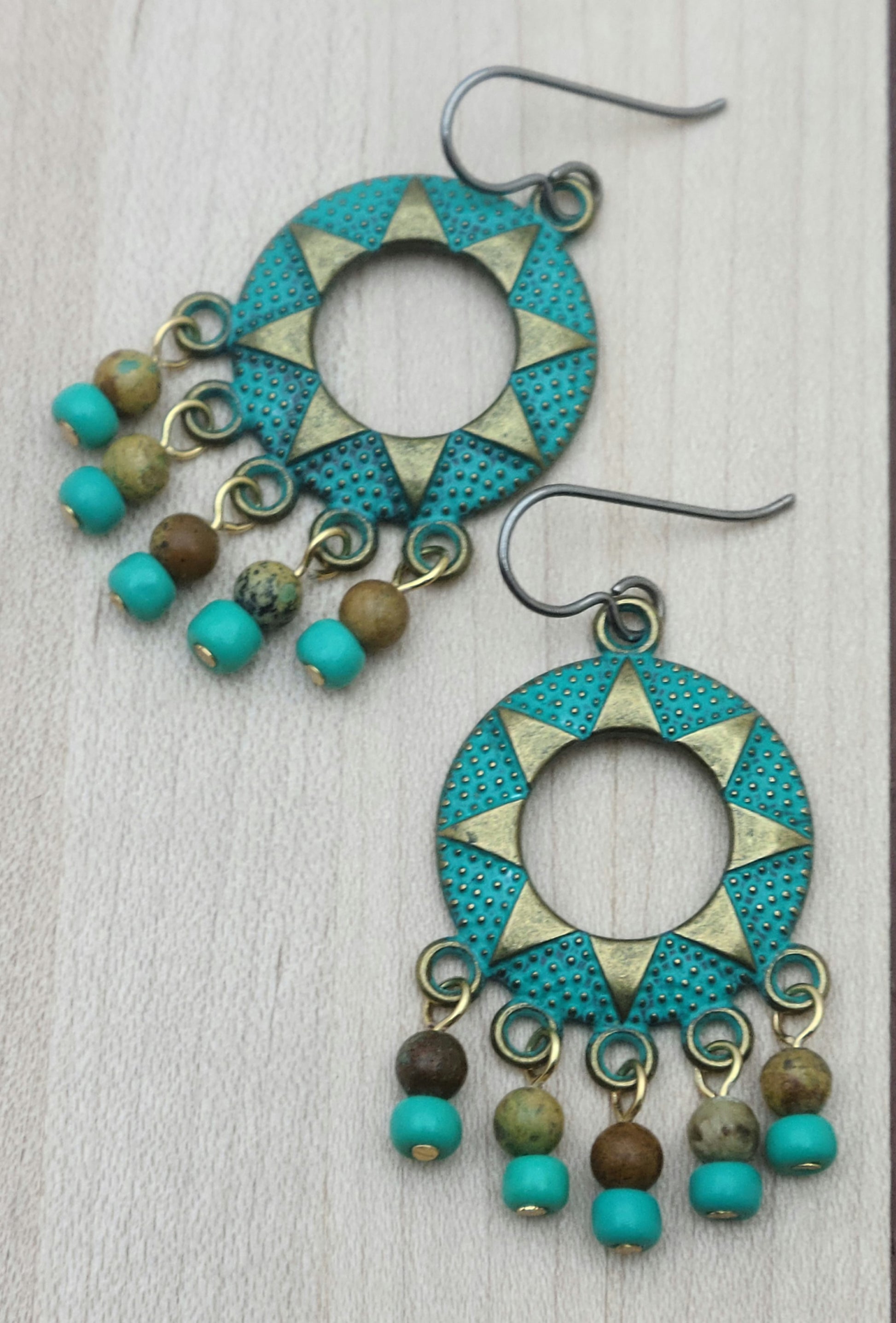 - Add a pop of color to your wardrobe with our Patina Green Sunburst Earrings. These statement earrings feature a chandelier design with patina green sunburst turquoise highlighted by seed bead accents. Perfect for adding a rustic touch to any outfit.