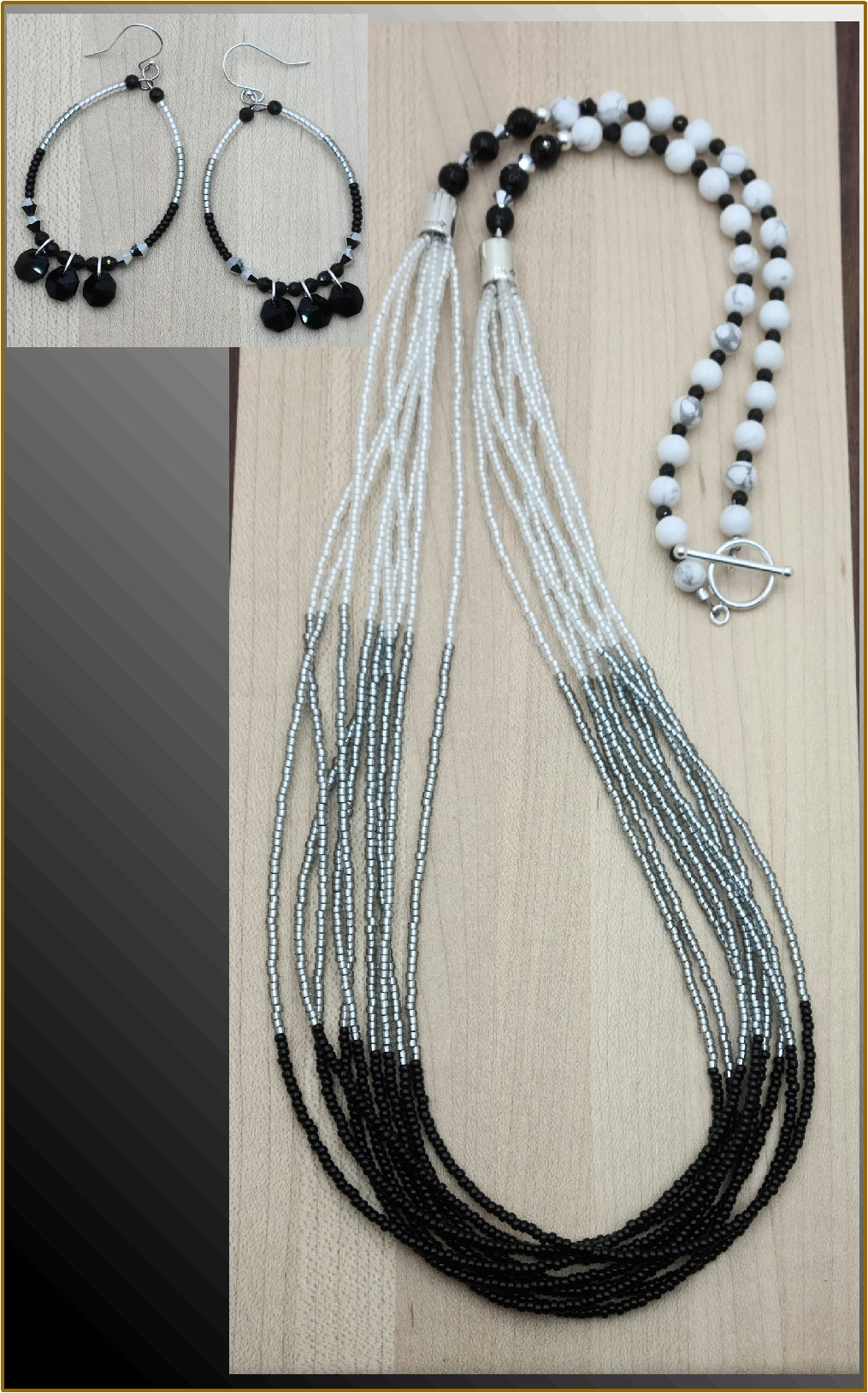 Make a statement with my Tuxedo Multi-Strand Necklace & Earrings.Hand-strung with top shelf Miyuki seed beads in black, silver, and white, this striking creation features nine strands, accentuated by sterling silver caps and black onyx, crystals*, howlite, and obsidian.The hoop earrings, lightweight and dramatic, complete the sophisticated and exclusive look.