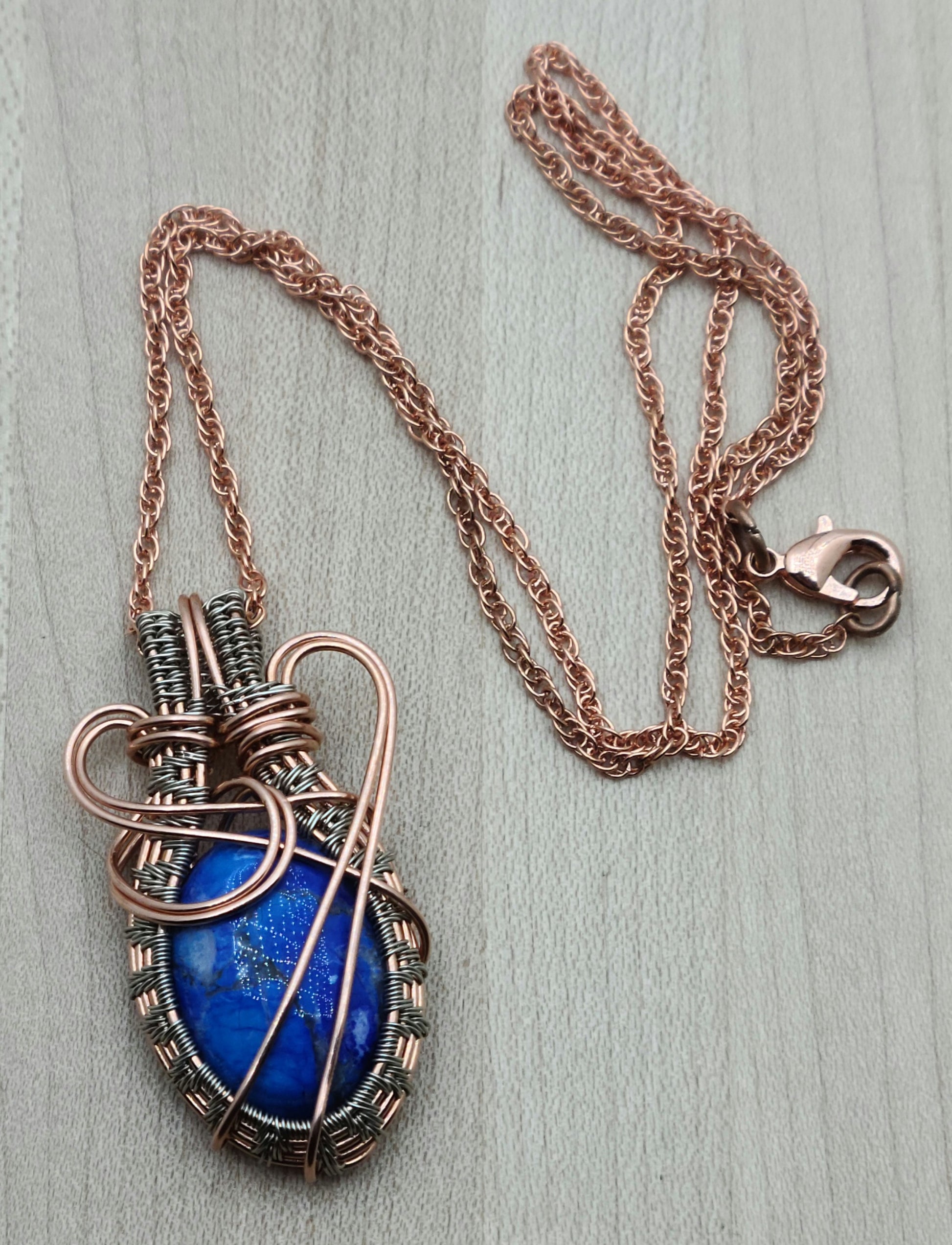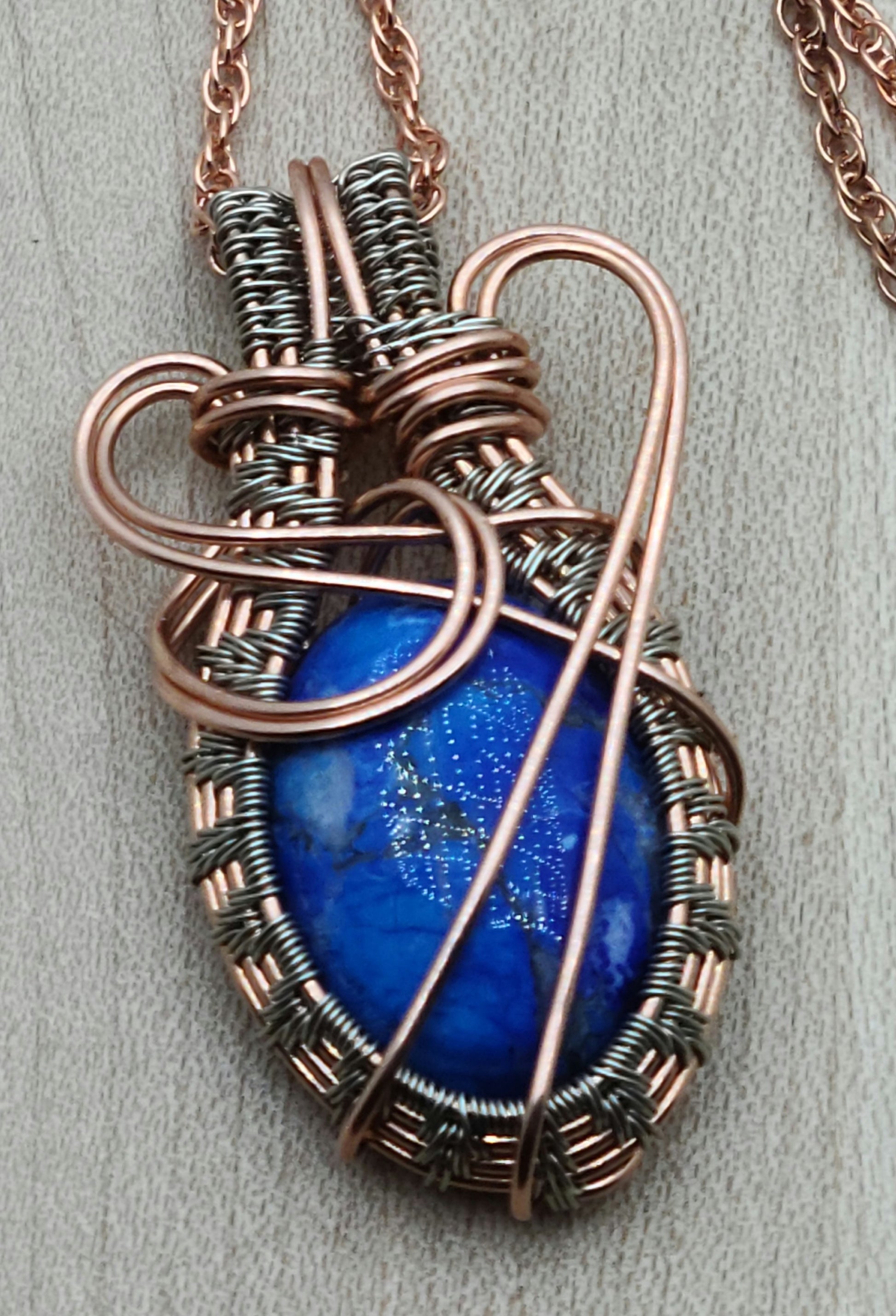 - A beautiful lapis lazuli cabochon is set off by a woven wire frame woven in an interesting combination of Copper & tinned copper.